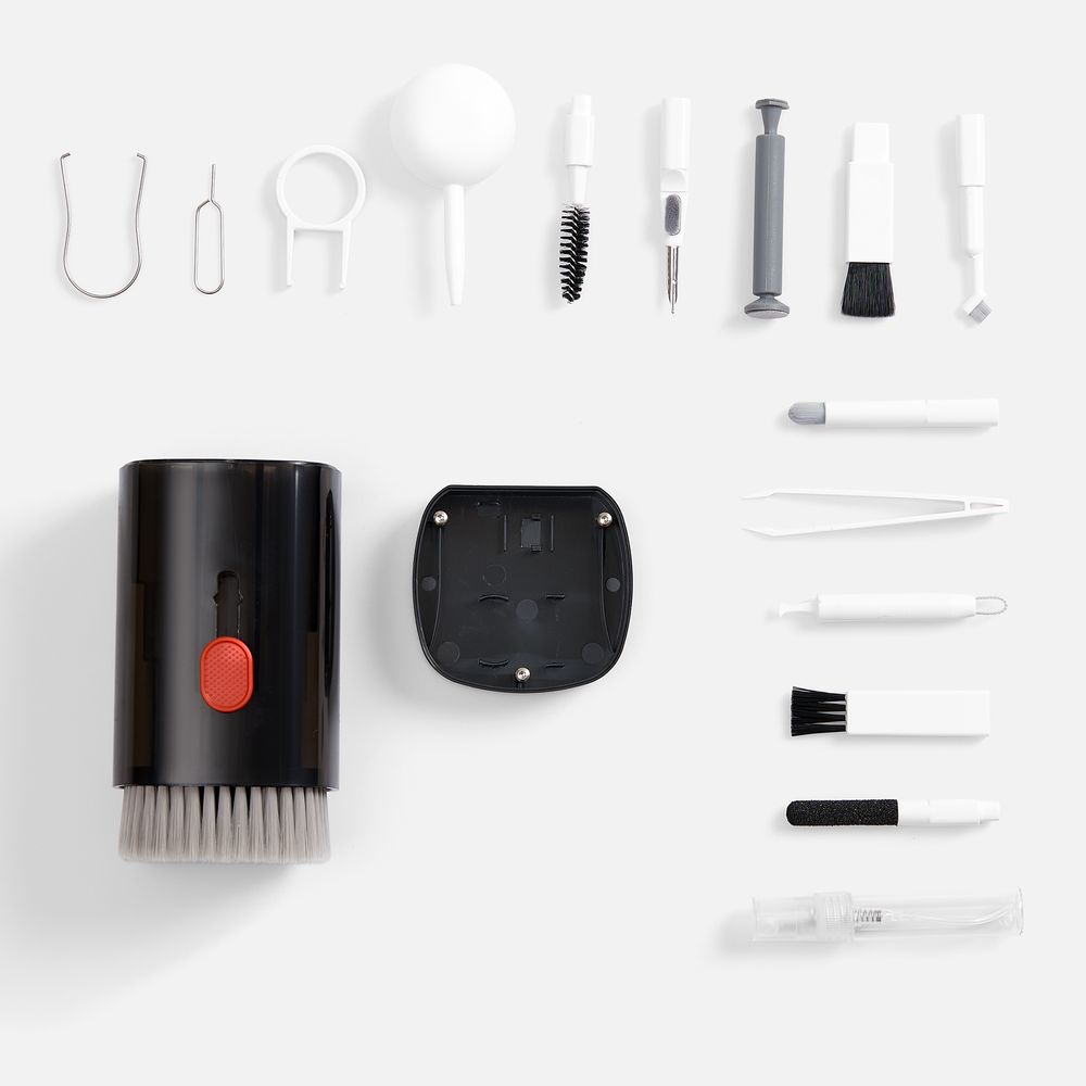 - В комплекте: большая щетка, салфетка для ухода за дисплеем, контейнер для жидкости, пластиковый пинцет, щетка с жесткой щетиной, щетка с мягкой щетиной, чистящее перо со щеткой для наушников, насадка для чистки кейса от наушников, ершик для чистки кейса от наушников, щетка с короткой щетиной, щетка с наклонной щетиной, двусторонняя насадка для чистки разъемов зарядки, двусторонняя насадка для чистки камеры, инструмент для продувки, дуговой пинцет, ключ для отсека SIM-карты, инструмент для извлечения поврежденных ключей