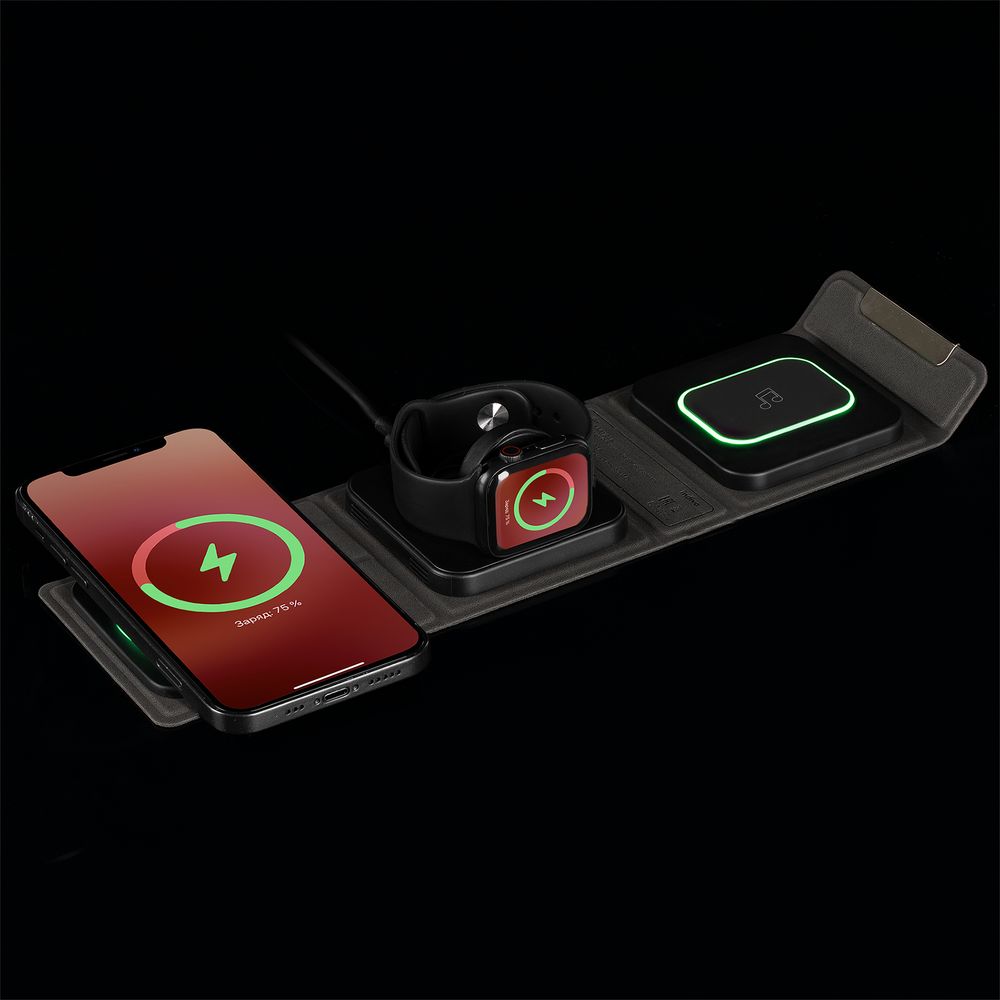 Зарядная станция совместима со всеми смартфонами, поддерживающими технологию беспроводной зарядки Qi. Также предусмотрено место для зарядки часов Apple Watch и наушников. Зарядка начнется автоматически при размещении устройств на индукционной площадке.