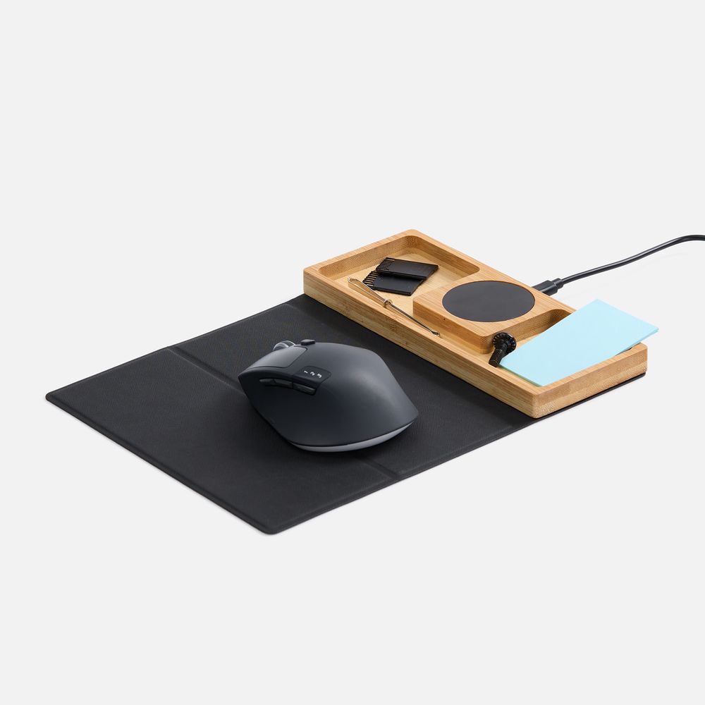 Midstream — это коврик для мышки с площадкой для беспроводной зарядки и отсеком для канцелярских принадлежностей. Его можно использовать как на работе, так и в дороге или на встречах: коврик компактно складывается и не занимает много места в сумке для ноутбука.