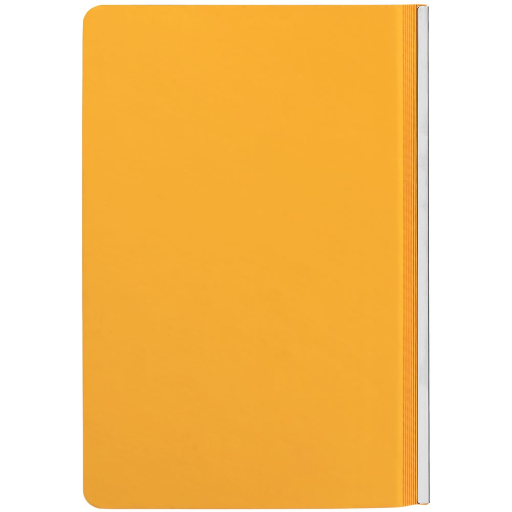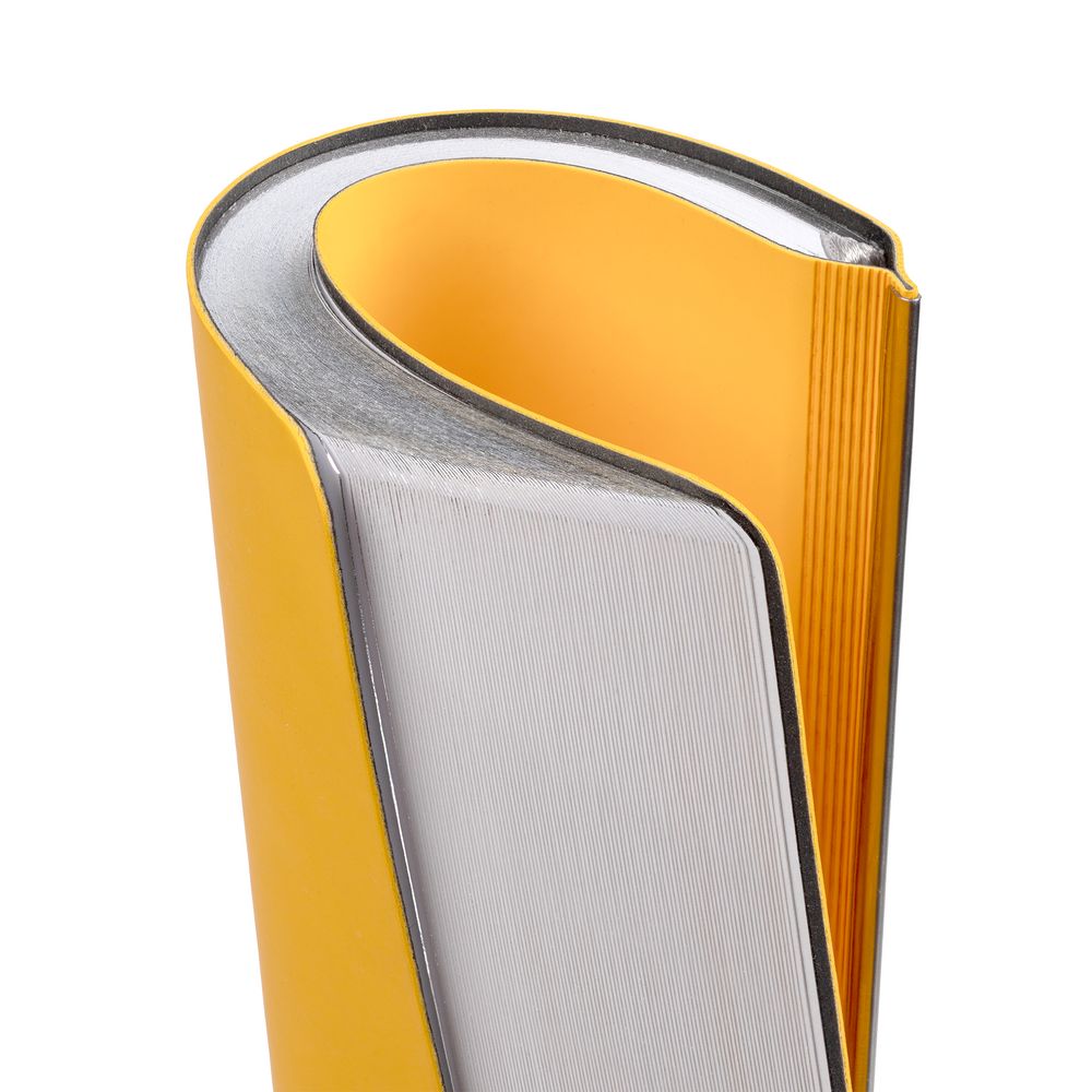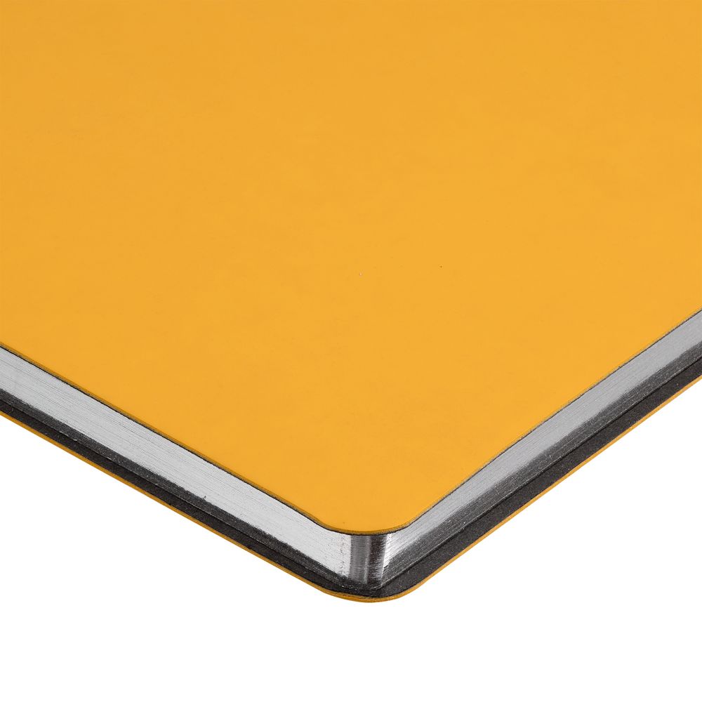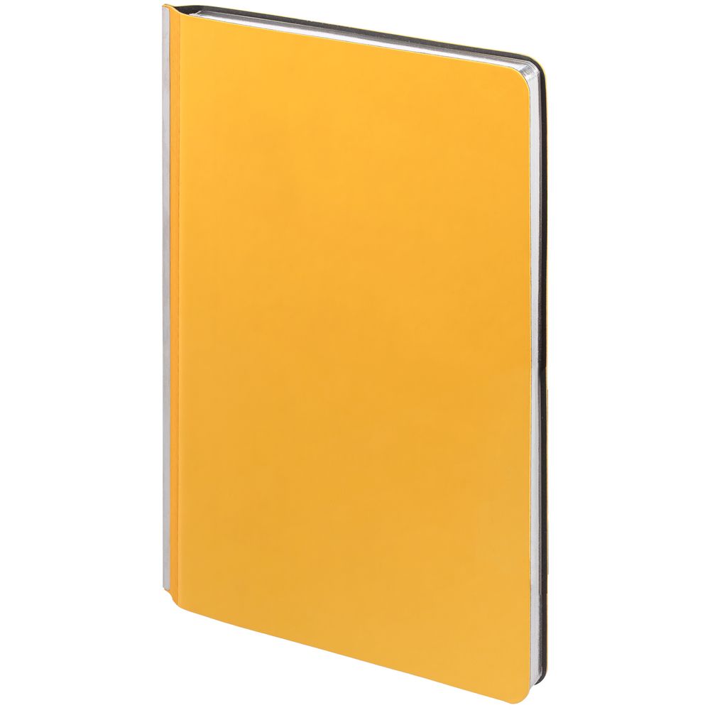 Ежедневник с гибкой обложкой и металлическим корешком, выполнен из материала Soft Touch, желтый КК, дополнен серебристым обрезом блока и ляссе.