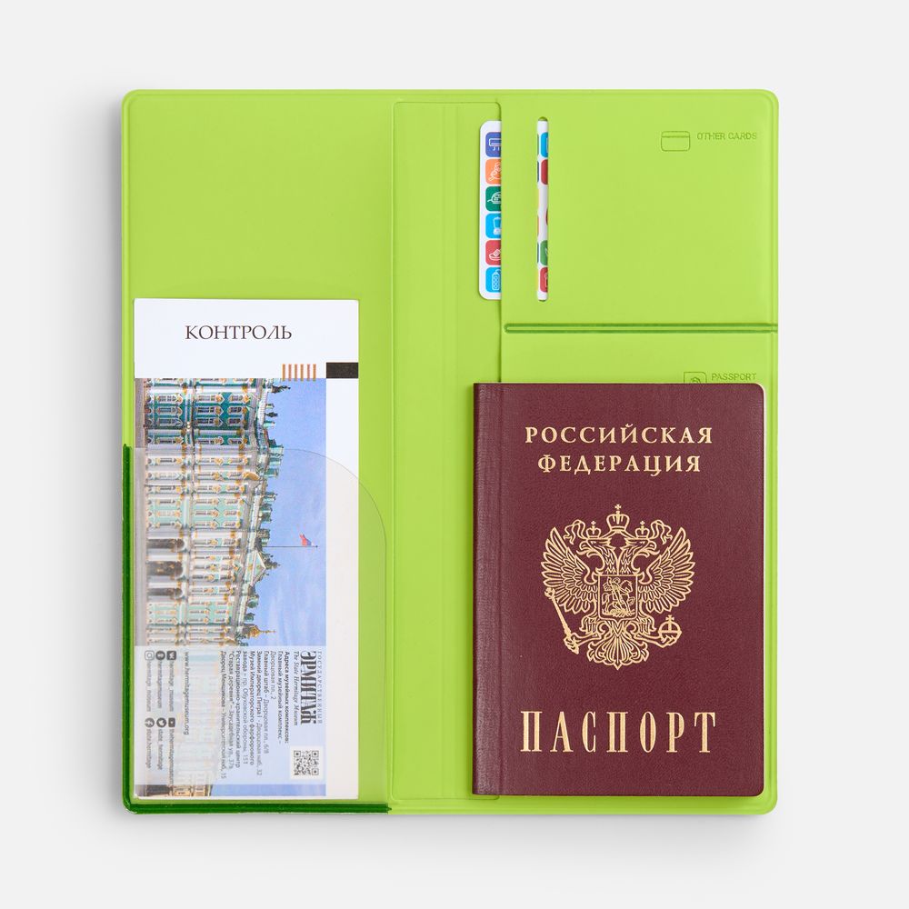 Органайзер имеет 5 отделений: для билетов, паспорта, визиток или кредитных карт.
