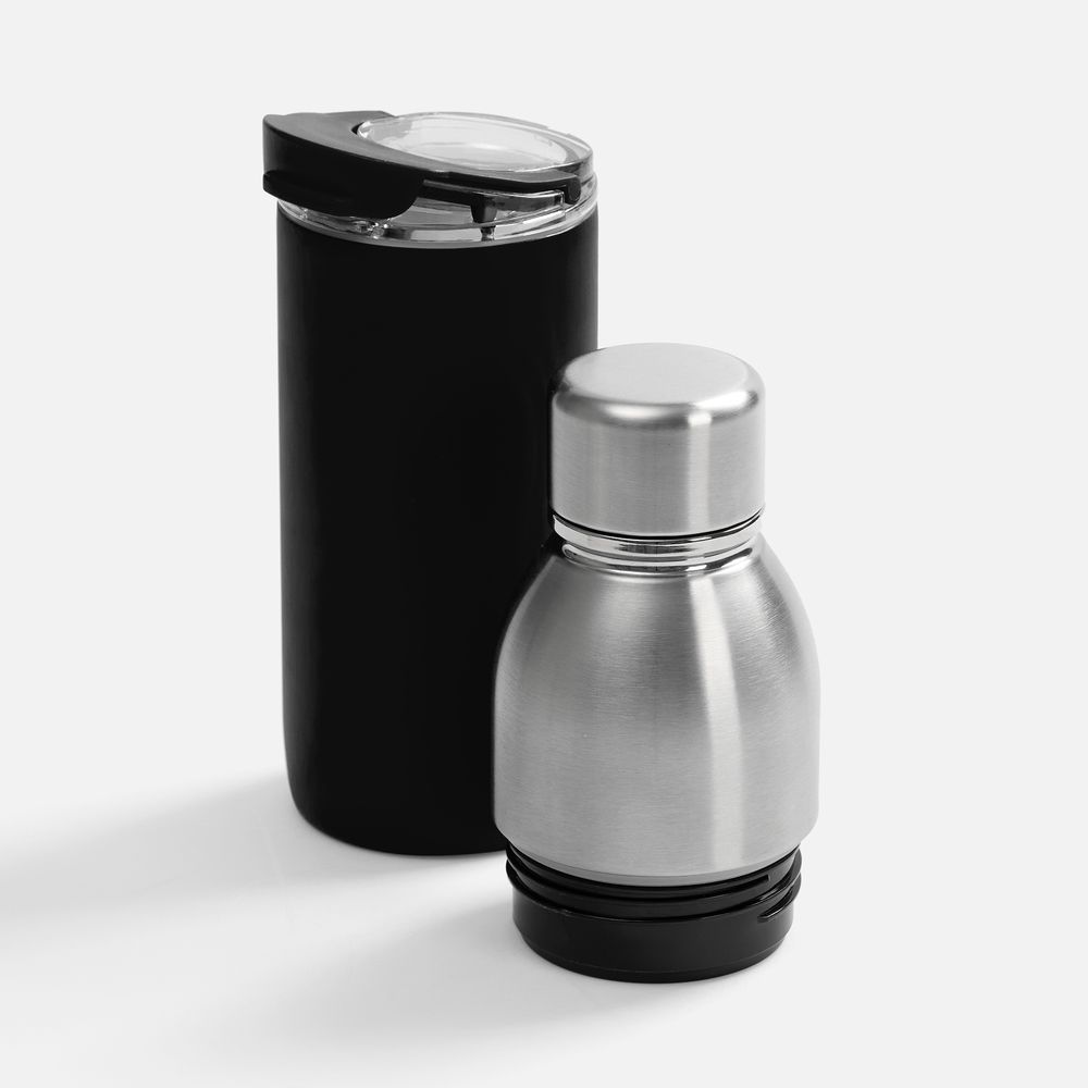 Varianti — это яркий пример посуды с двойной функциональностью. Один и тот же корпус можно превратить как в термостакан для чая и кофе с пластиковой крышкой, так и в термобутылку для прохладительных напитков — с крышкой стальной.