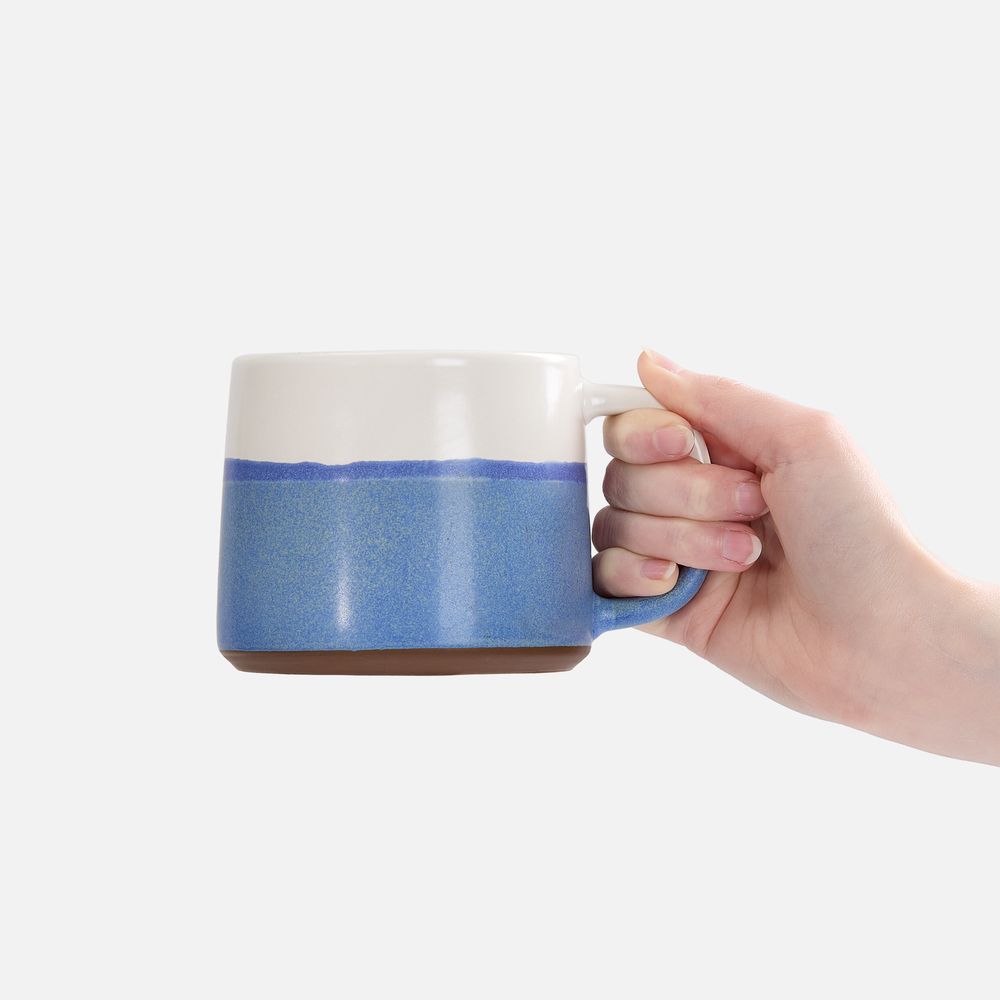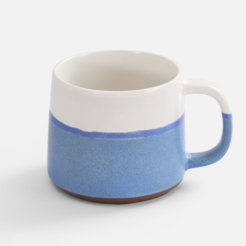 Нижняя половина кружки покрыта реактивной глазурью — особым видом керамического покрытия, компоненты которого вступают в химическую реакцию во время обжига при температуре 1200°C и выше. Из-за непредсказуемого взаимодействия компонентов создаются уникальные переливы, узоры и текстуры, поэтому в партии невозможно найти два абсолютно одинаковых изделия.