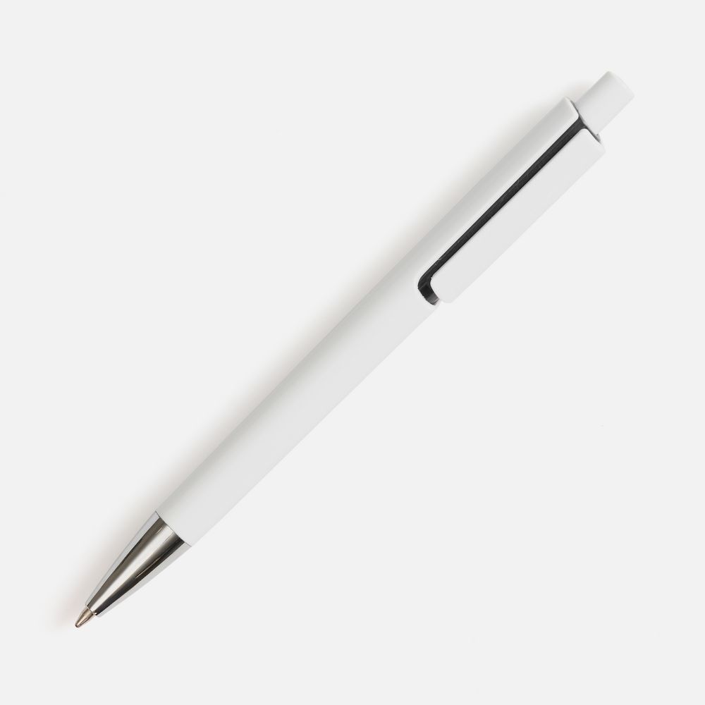 Шариковая ручка с глянцевым белым корпусом и цветовым акцентом у клипа, который дополнит логотип компании.