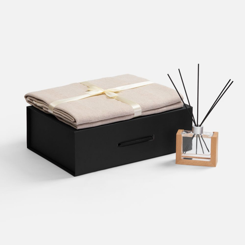 Материал флакон - стекло, палочки из файбера; подставка для флакона - дерево; плед - хлопок 95%, полиэстер 5%, плотность 300 г/м²; коробка - переплетный картон, бумага Malmero